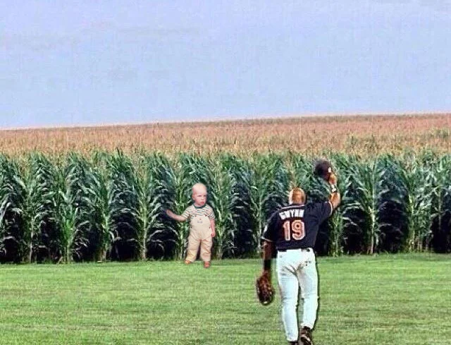 He was THE hitter of his generation and is disgustingly under-rated. He batted an utterly amazing .338 for his fucking CAREER in modern day baseball, people. That's most Major League shmizbo's BEST single season average...and Gwynn hit that average for twenty fucking years. In honor of the great Tony Gwynn, here's an odd photo-shop of Tony and I (as a two-year old) entering the Field Of Dreams cornfield. I guess we're both dead.