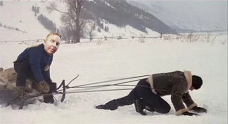 Ivan Drago is a cheater. A big, blonde, steroid-taking cheater. Davey, on the other hand, is the People's Champ. Look at David on that sled. He looks so pleased. But that, my friends, is because he just peed himself.