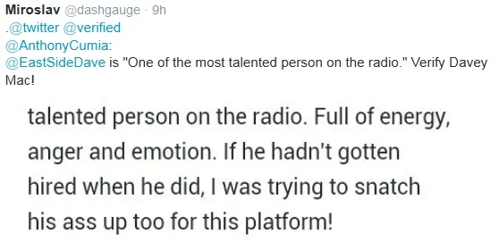 It was pointed out to the Dave Man on Twitter, that Anthony (formerly of The Opie & Anthony Show and now of The Anthony Cumia Show) had very kind words to say about me. He stated on a Reddit "Ask Me Anything" that I am "one of the most talented person(s) on the radio." See the Tweet on the picture in this post for the whole quote. Anyway, I wanted to say that I'm very complimented. I'm extremely happy to be working for WRAT, 95.9 The Rat (the radio station that I've ALWAYS loved), but nonetheless the nice words from Anthony make me feel good. Appreciated! Anyway, check out Carl & Dave on 95.9 The Rat each weekday at 6 AM (EST)!! Go to WRAT.com!! Peace!!