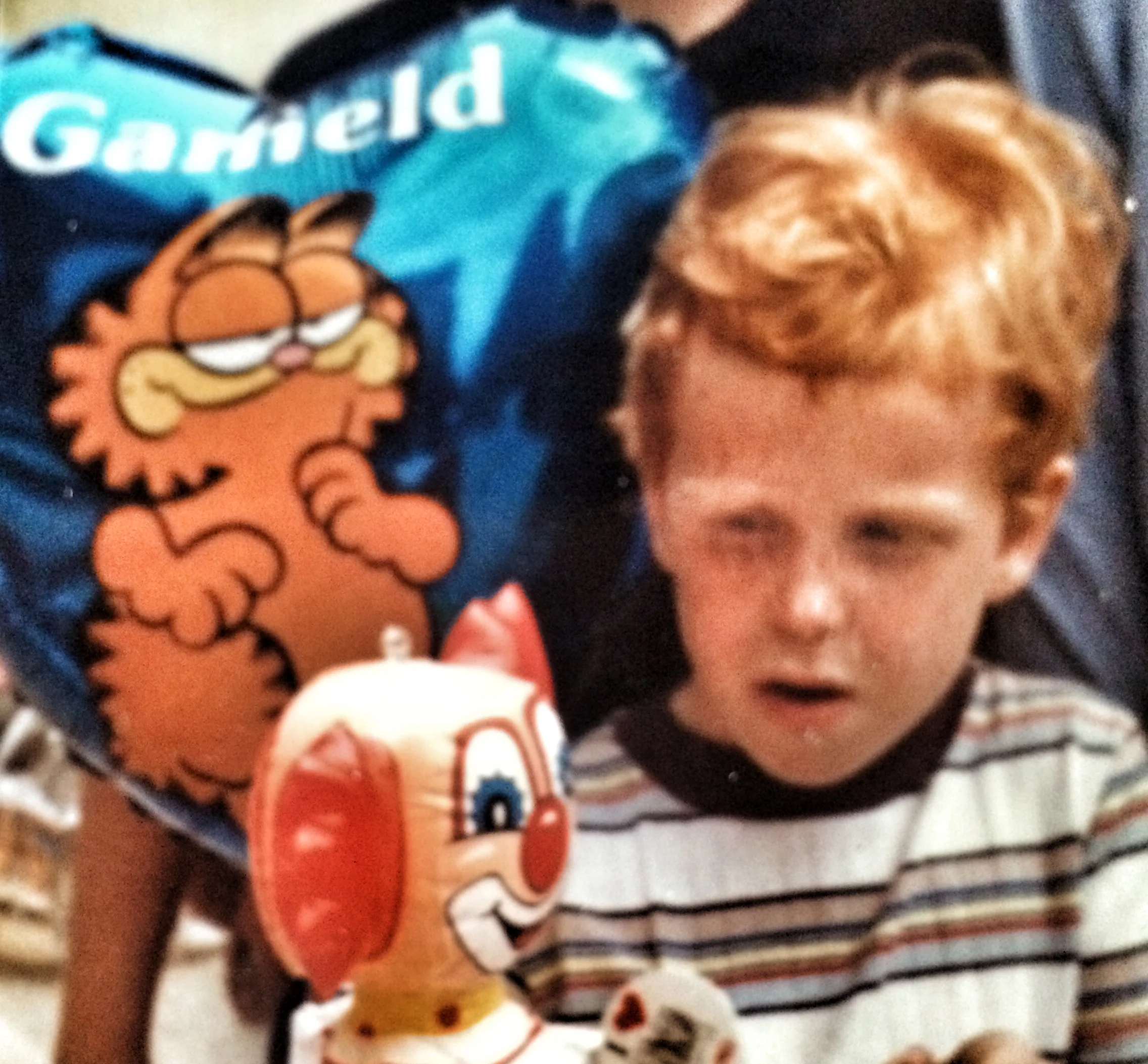 This disturbing photograph comes to you from the year 1985. Clearly, David is either confused or frightened by the clown balloon. Meanwhile, the Garfield balloon leers menacingly in the background......as if to cruelly say, "I can't wait for Little Davey's nightmares to begin." Have a good afternoon.