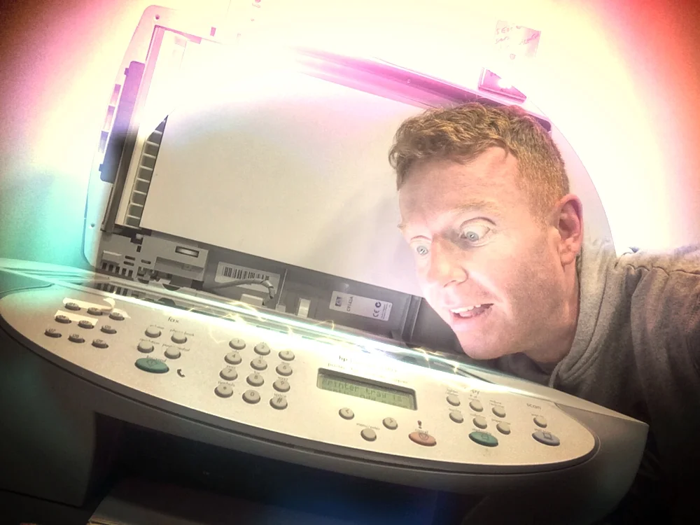 I'm here doing our morning show (Carl & Dave and the Morning Rat Race) on Jersey's legendary, WRAT, 95.9 FM; and I'm realizing that I cannot work the copy machine. Where do you put the paper in? Is this thing a scanner? Or do I insert the paper into some sort of slot to make the copies? I often get so confused, I just stare (two inches away) from said copy machine and alternately scream and cry at my inability to work it. Ah, screw it. Who needs to make copies of their W-2 forms and death-wills anyway? Bye, dogsie!