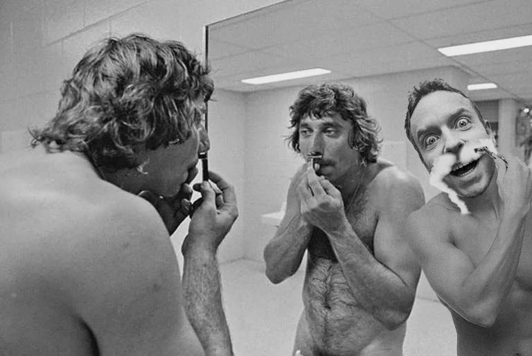 I don't know what the phrase "too close for comfort" is and I don't care. When I like to keep myself in pristine appearance, I enjoy shaving, shirtless, next to Joe Namath. Real men. Doing real, naked things together. Shaving cream: it's for shaving. This has been a public service announcement from Dave McDonald.