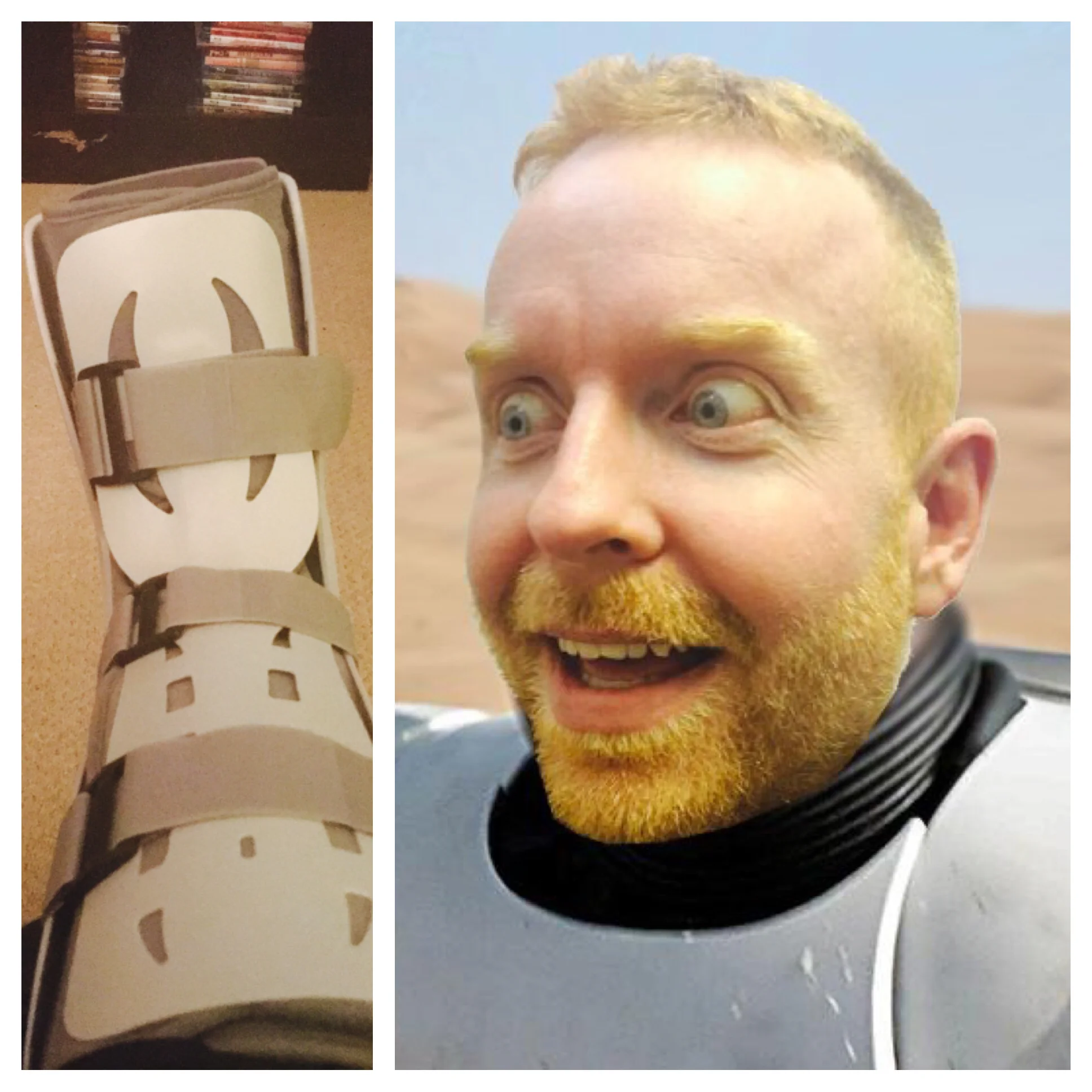 My ankle has been shattered like a pizza whose topping is dynamite and then blown up by Wile E. Coyote.......sorry.......that's the painkillers talking. Quite frankly, I've been training my stuffed animals to compete in the next Olympics since I've been injured and------sorry again. That was the painkillers. Anyway, while breaking your ankle sucks, at least they give you this radical Stormtrooper boot to wear. So, now my Stormtrooper outfit is complete!! God bless America!!