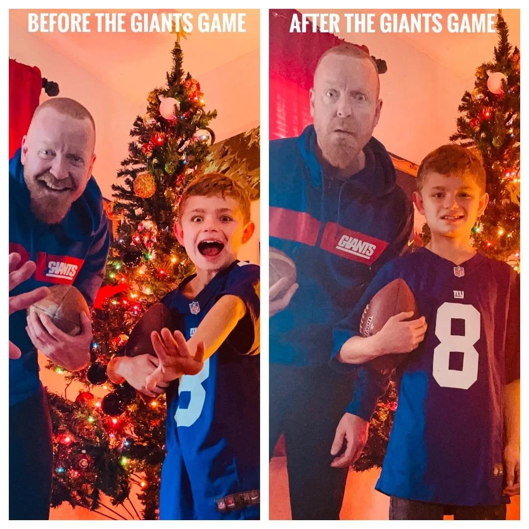 Davey Mac here. And I want you to take a look at the photo in this article. The picture is of my son Stanley and myself. It is a before-and-after shot of us during the Giants game yesterday. Look at how happy we were before the game. And look at how miserable we were after the game. The Giants are killing me. They are beyond terrible. FIRE EVERYONE. Have a nice day.
